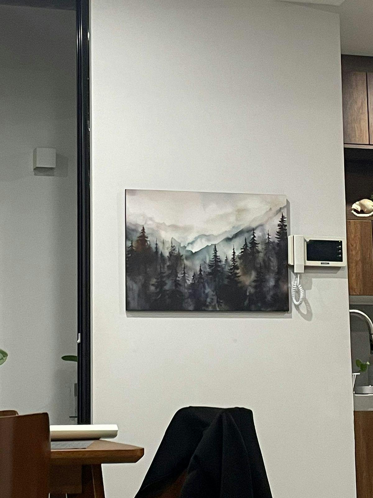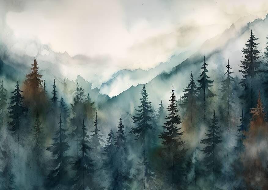 印刷する水彩画の森の風景:緑の森の木の絵。印刷する壁アート。デジタルアート。自然の装飾。山の森のアート。