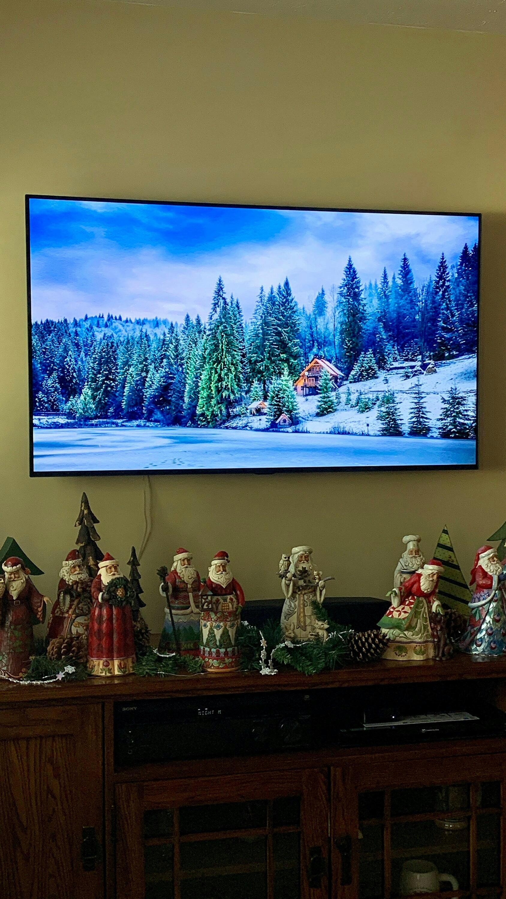 Set of 25 Samsung Frame TV 4K Art. Christmas & Winter Landscapes Digital Art Collection. Holiday Decor Art Set Instant Download Frame TV Art displayed on Samsung Frame TV on a living room wall.